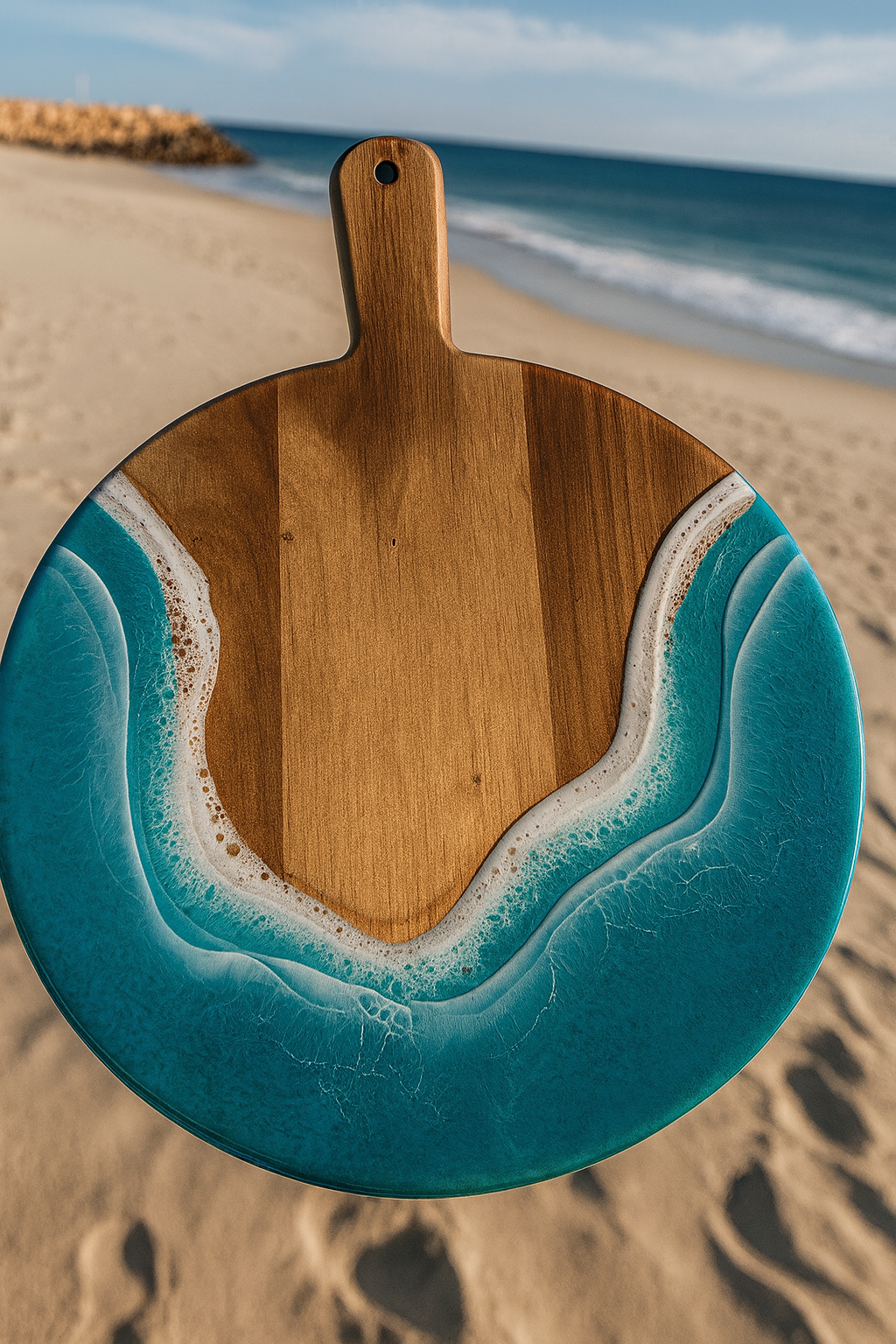 What started as a creative outlet during maternity leave quickly turned into a passion. I began experimenting with resin and fell in love with its flow – so much like the ocean itself. Today, I handcraft one-of-a-kind pieces from my home studio, using eco-conscious materials to give old surfboards new life.